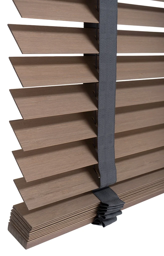 Szerokie lamele pięknie eksponują strukturę drewna i pozwalają precyzyjnie regulować ilość światła w pomieszczeniu.